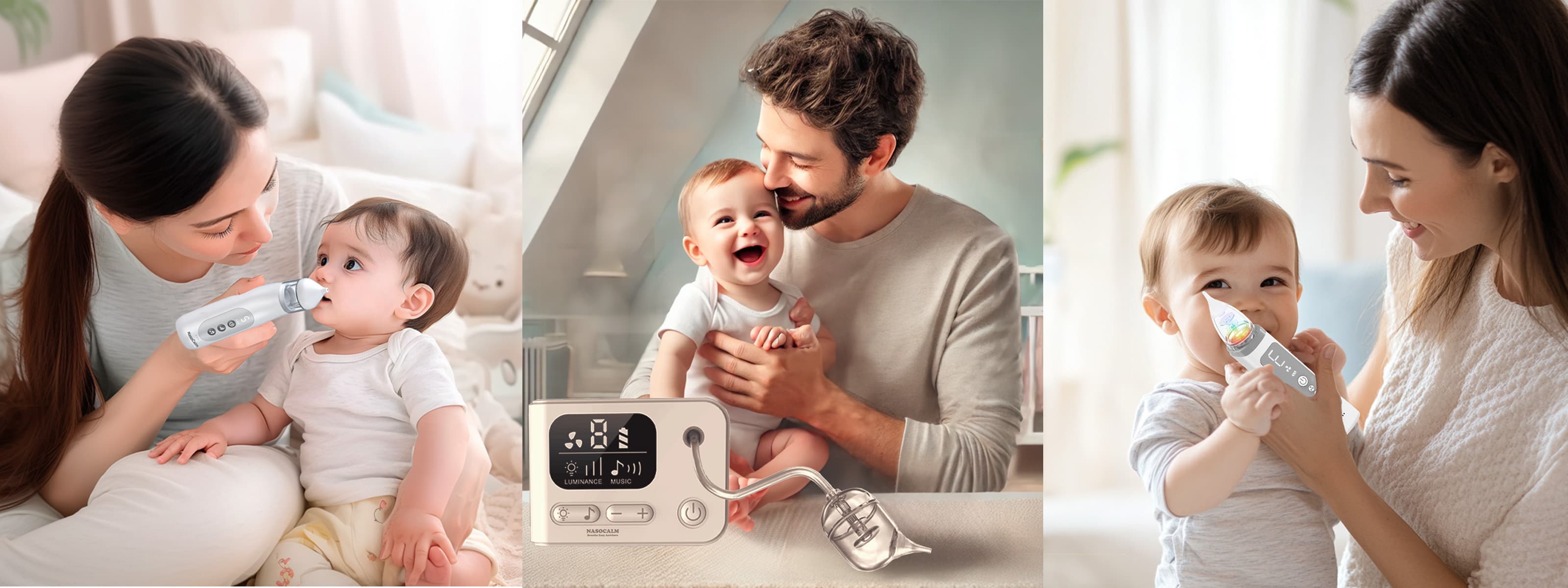 Discover Nasocalm's range of advanced electric baby nasal aspirators, specially designed to provide safe, stress-free relief from nasal congestion in infants and toddlers. Featuring medical-grade silicone tips, gentle yet powerful suction, anti-backflow design, soothing LED lights, and calming music, our aspirators make nasal care quick, quiet, and easy—whether at home or on the go.