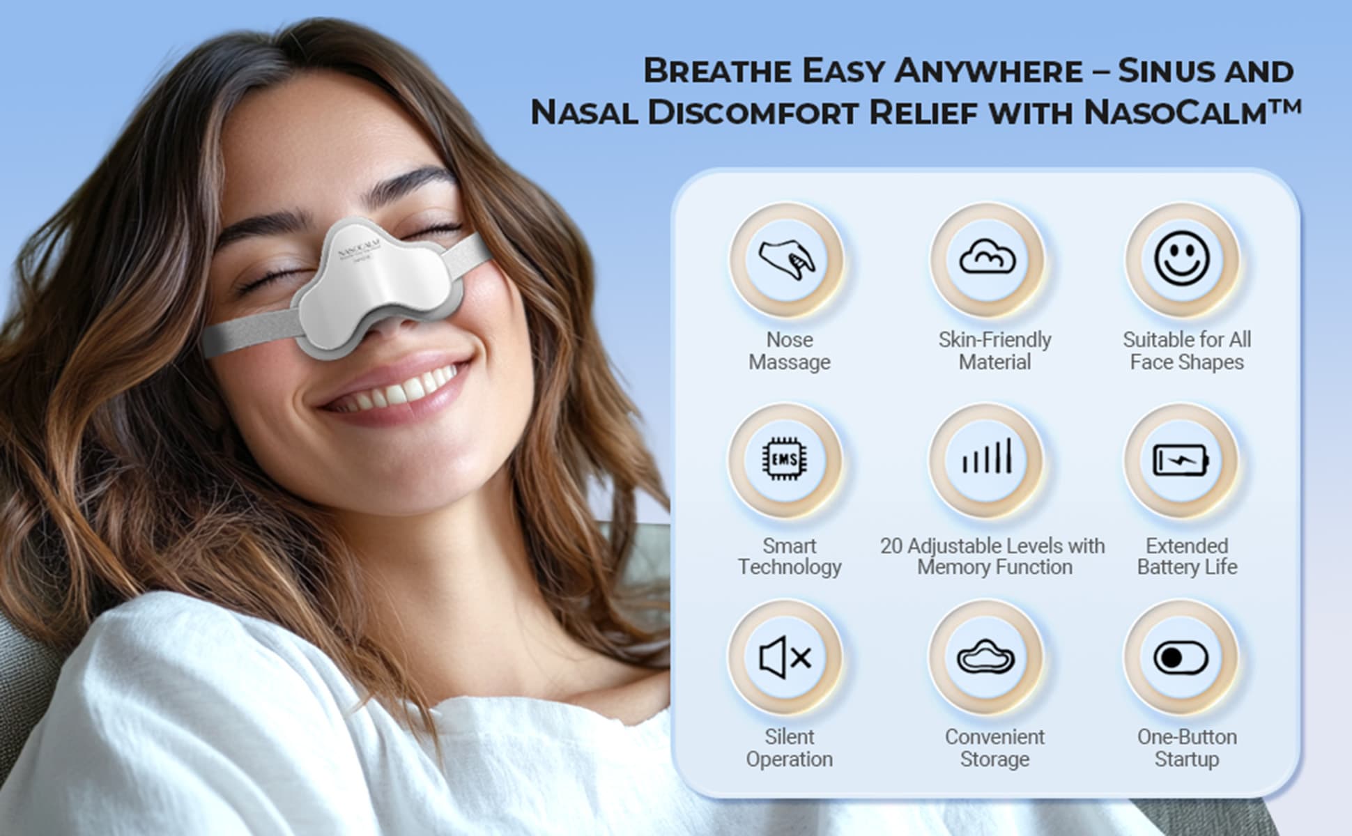 Whether you suffer from seasonal allergies, sinus congestion, or just need a little help breathing easier, the NASOCALM™ EMS Nose Massager is your go-to solution. With its advanced EMS technology and portable design, NASOCALM™ provides relief whenever and wherever you need it.